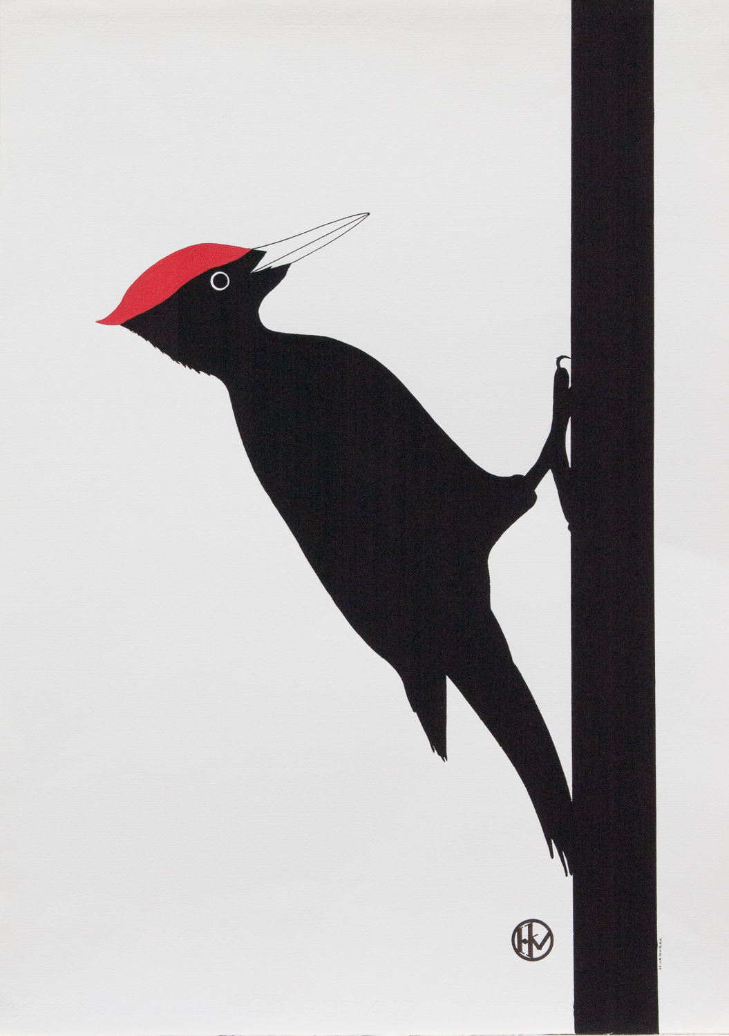 Zwarte specht aan boomstam. Gouache met afmeting 70 x 50 cm. Prijs € 400,-