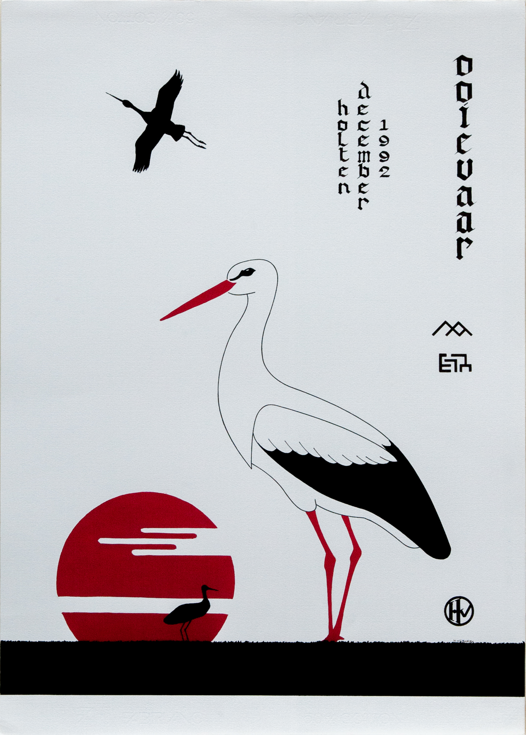 Ooievaars bij opkomende zon. Afmeting gouache 70 x 50 cm. Prijs € 400 ,-