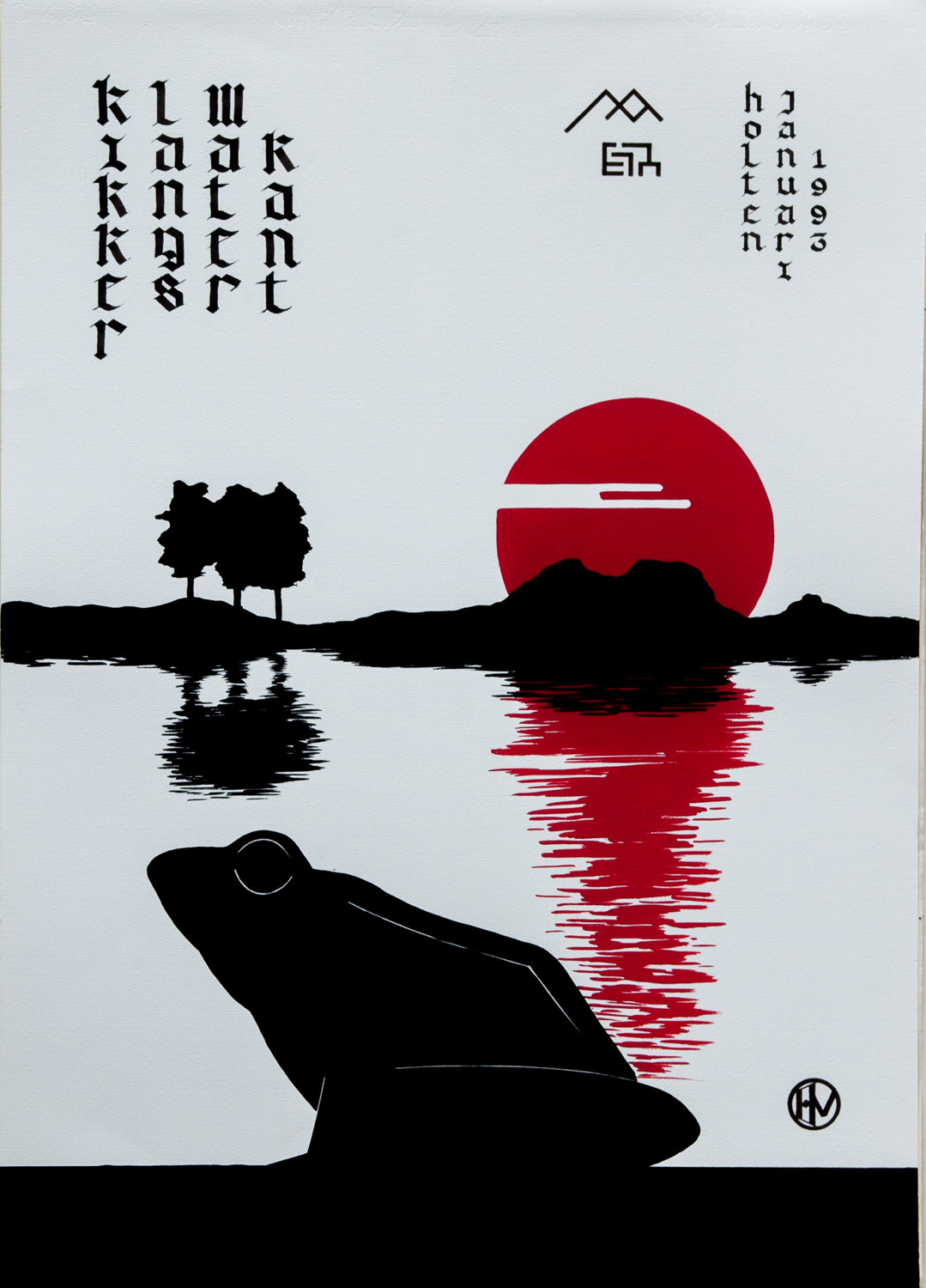 Tekst :" kikker langs waterkant", bij opkomende zon. Verticaal goed te lezen. Afmeting gouache 70 x 50 cm . Prijs € 400.